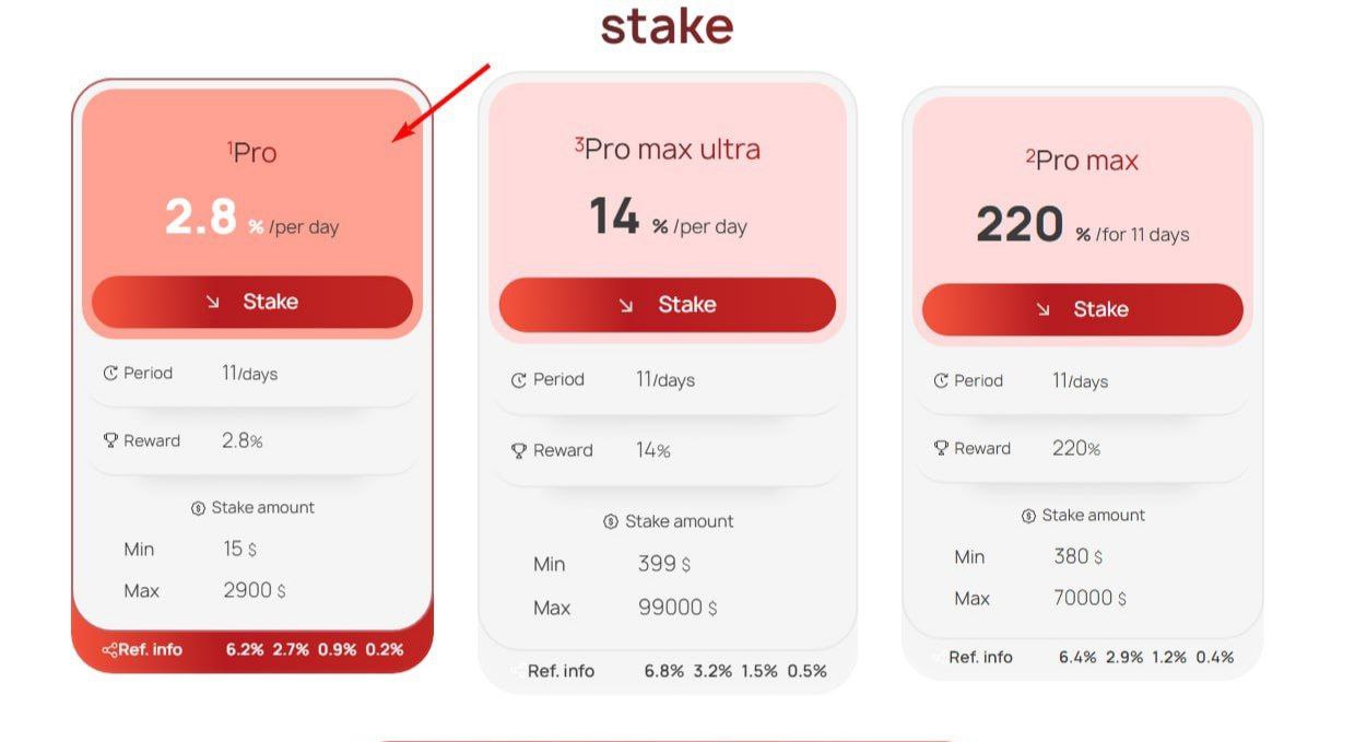 پلنها : %2.8 روزانه برای 11 روز ،(بازگشت اصل سرمایه آخر دوره ) ,%14 روزانه برای 11 روز ( پلن roi اصل و سود باهم ) %220 بعد از 11 روز |